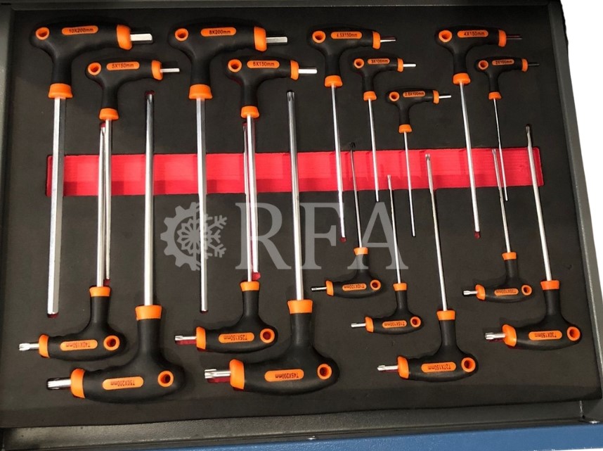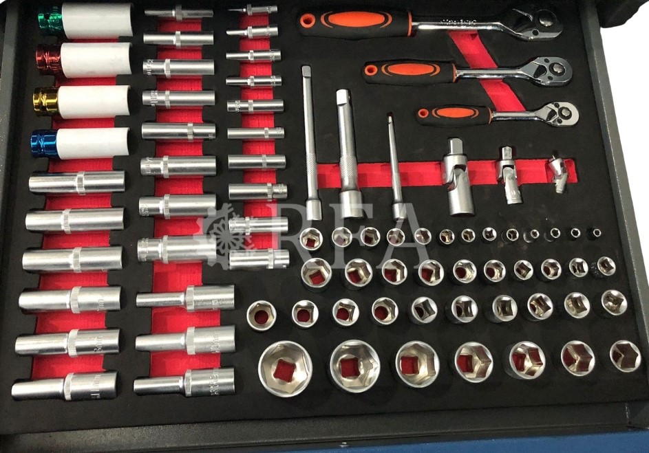 Cuenta con 7 cajones horizontales y 1 vertical, llave de seguridad y equipado con herramientas.